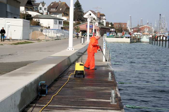 | 15.03.2007 - 14:30 Uhr - Kappeln/Schlei: Gastliegerhafen Gereinigt wird der Steg und der Betonholm mit Hilfe eines Hochdruckreinigers. Foto: Eckhard Schmidt - Kappeln - (C) 2007 |