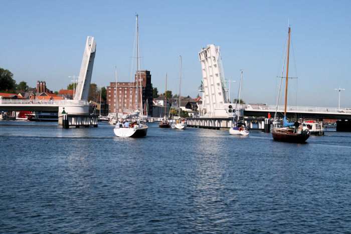 | 05.05.2007 - 14:48 Uhr - Kappeln/Schlei: Schleibrücke Brückenöffnung: 14:45 Uhr Die meisten Sportboote sammeln sich auf der Südseite der Brücke. Foto: Eckhard Schmidt - Kappeln - (C) 2007 |