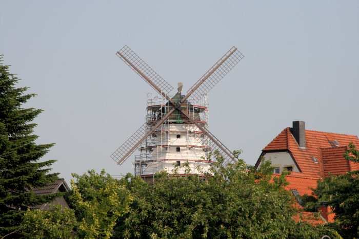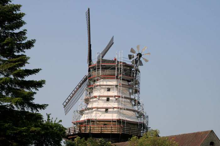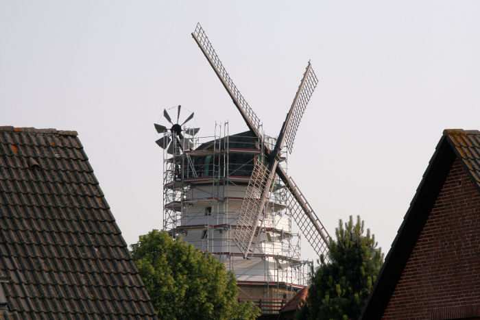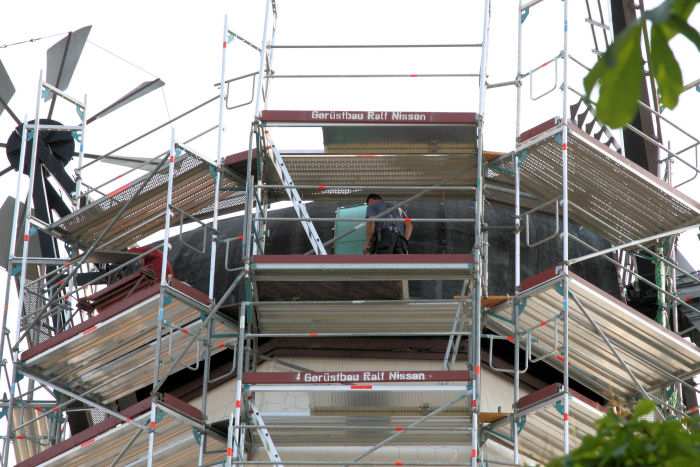 | 08.06.2007 - 8:37 Uhr - Kappeln/Schlei: Mühle Amanda" Hier kann man es besser erkennen. Der erste Streifen Kupferblech wurde auf dem Kopf der Mühle befestigt. Foto: Eckhard Schmidt - Kappeln - (C) 2007 |