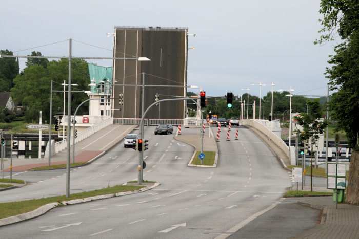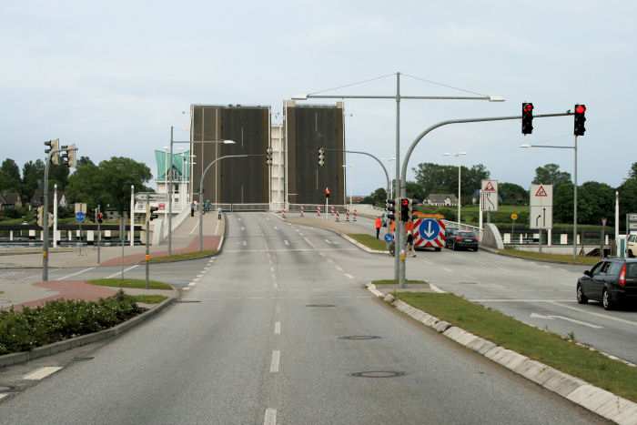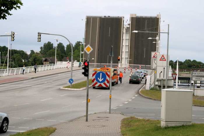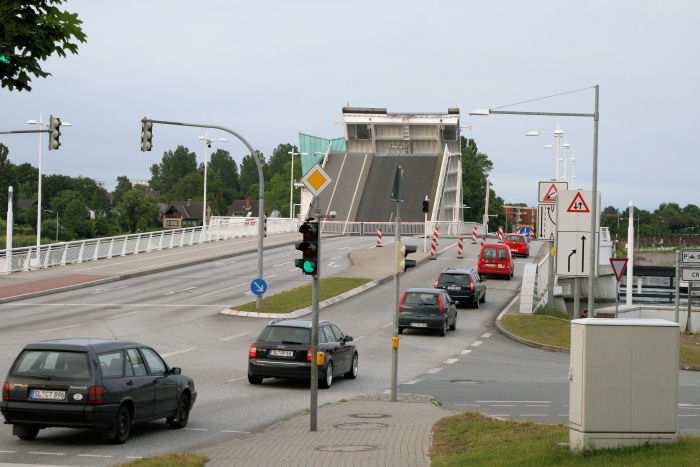 | 16.06.2007 - 20:21 Uhr - Kappeln/Schlei: Schleibrücke Nördliches Klappenpaar C/D (links) gestört Der komplette Verkehr wird jetzt über das südliche Klappenpaar A/B (rechts) geleitet. Foto: Eckhard Schmidt - Kappeln - (C) 2007 |