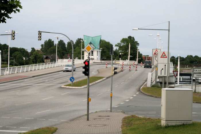 | 16.06.2007 - 20:17 Uhr - Kappeln/Schlei: Schleibrücke Nördliches Klappenpaar C/D (links) gestört Mitarbeiter der Straßenmeisterei stellen Baken auf der Brücke auf, damit der komplette Verkehr über das südliche Klappenpaar A/B (rechts) geleitet werden kann. Foto: Eckhard Schmidt - Kappeln - (C) 2007 |