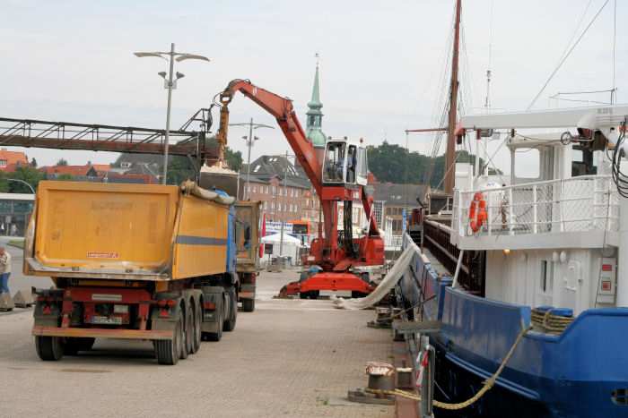 | 02.07.2007 - 9:22 Uhr - Kappeln/Schlei: Südhafen Die BARENTSZZEE hat mit einer Ladung Kalk im Südhafen festgemacht Jürgen Bähr von der Firma Ostseedienst aus Kappeln ist gerade dabei das Schiff mit Hilfe eines Baggers zu entladen. Foto: Eckhard Schmidt - Kappeln - (C) 2007 |