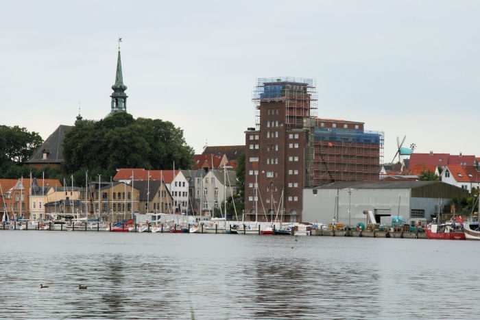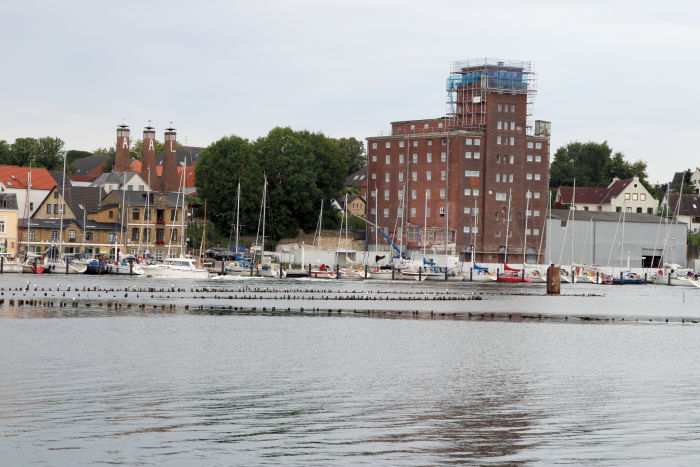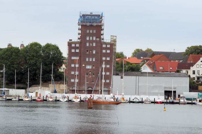 | 02.08.2007 - 8:58 Uhr - Kappeln/Schlei: PK-Speicher im Nordhafen Ost- und Nordseite des PK-Speichers Blick vom Gastliegerhafen empor zum PK-Speicher. Der Turm in der Mitte des Speichers wurde gestern fertig eingerüstet, damit das Dach des Turmes ebenfalls saniert werden kann. Foto: Eckhard Schmidt - Kappeln - (C) 2007 |