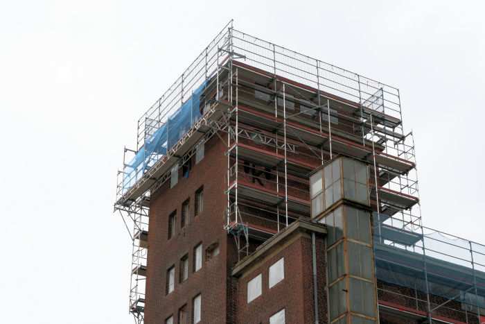 | 02.08.2007 - 8:57 Uhr - Kappeln/Schlei: PK-Speicher im Nordhafen Ostseite des PK-Speichers Blick vom Gastliegerhafen empor zum PK-Speicher im. Der Turm in der Mitte des Speichers wurde gestern fertig eingerüstet, damit das Dach des Turmes ebenfalls saniert werden kann. Foto: Eckhard Schmidt - Kappeln - (C) 2007 |