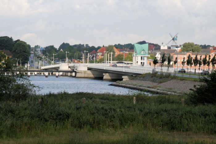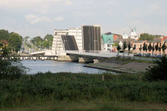 | 17.08.2007 - 8:45 Uhr - Kappeln/Schlei: Schleibrücke Die beiden Klappenpaare klappen immer noch nicht im Gleitakt Brückenöffnung 8:45 Uhr Das südliche Klappenpaar A/B benötigt immer noch die doppelte Laufzeit als das nördliche Klappenpaar C/D. Es werden gerade die Verkehrsampeln der Brücke auf Rot" geschaltet. Blick von Loitmark in Richtung der Schleibrücke. Foto: Eckhard Schmidt - Kappeln - (C) 2007 |