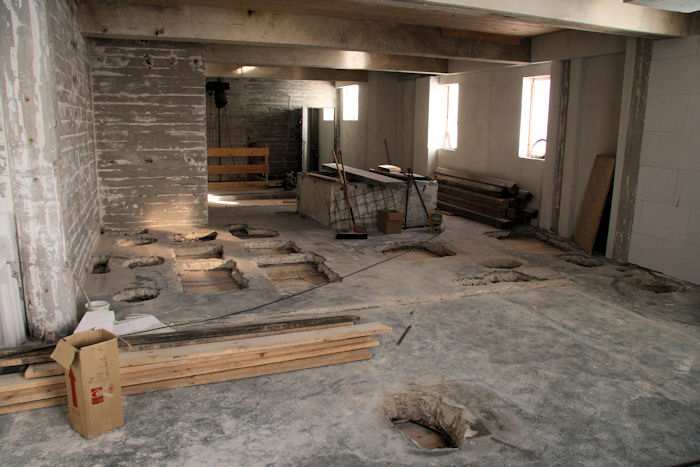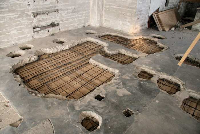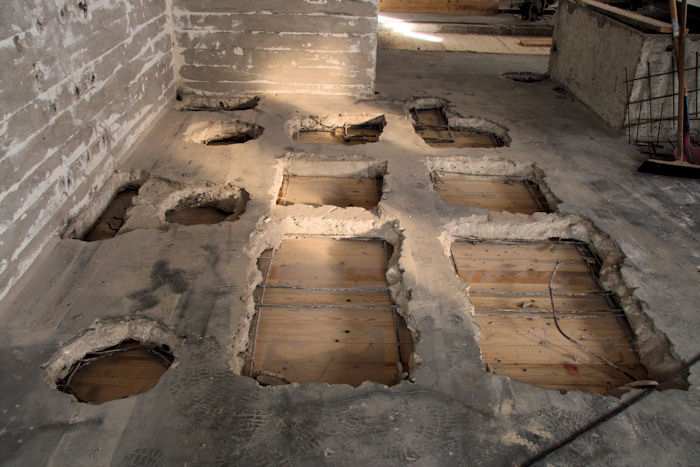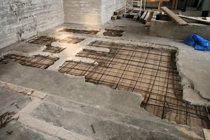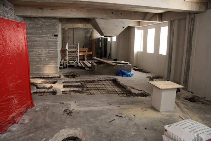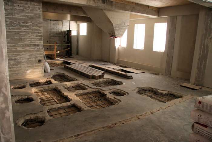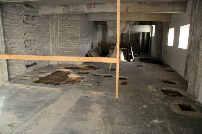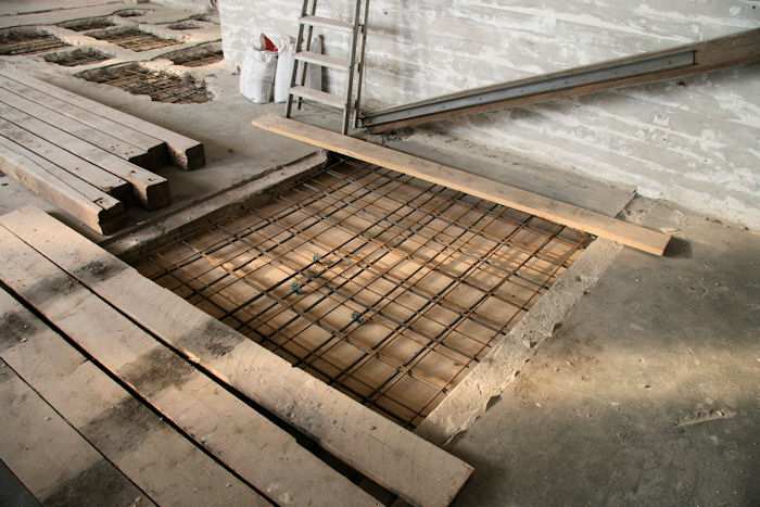 | 07.11.2007 - 10:38 Uhr - Kappeln/Schlei: PK-Speicher im Nordhafen 1. Obergeschoss Ostseite - Blick auf den Boden des Stockwerkes. In die Deckendurchbrüche wurde bereits die Bewehrung eingebaut. Links hinter der Betonwand befinden sich die Silozellen. Foto: Eckhard Schmidt - Kappeln - (C) 2007 |