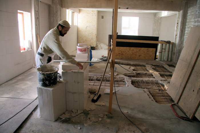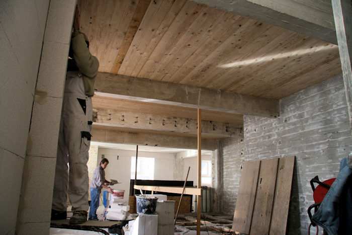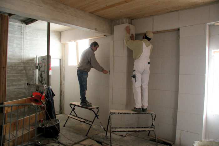 | 07.11.2007 - 10:34 Uhr - Kappeln/Schlei: PK-Speicher im Nordhafen 2. Obergeschoss Blick in Richtung Treppenhaus. Maurer sind gerade dabei die Außenwände (in diesem Fall die Ostseite) von innen mit Ytong-Steine zu verkleiden. Foto: Eckhard Schmidt - Kappeln - (C) 2007 |