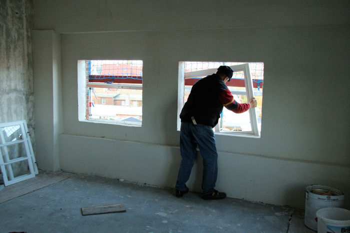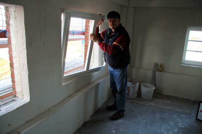 | 07.11.2007 - 10:44 Uhr - Kappeln/Schlei: PK-Speicher im Nordhafen 6. Obergeschoss Die restaurierten Fenster werden von Innen in die Öffnungen einbaut. Auf der Nordseite (rechts) wurden schon vor einigen Wochen die Fenster eingebaut. Hier kann man bei den Fenstern sehr gut die Ytong-Steine erkennen, die vor die Innenseite der Außenwände gemauert wurden. Foto: Eckhard Schmidt - Kappeln - (C) 2007 |