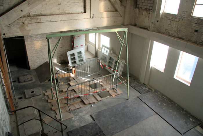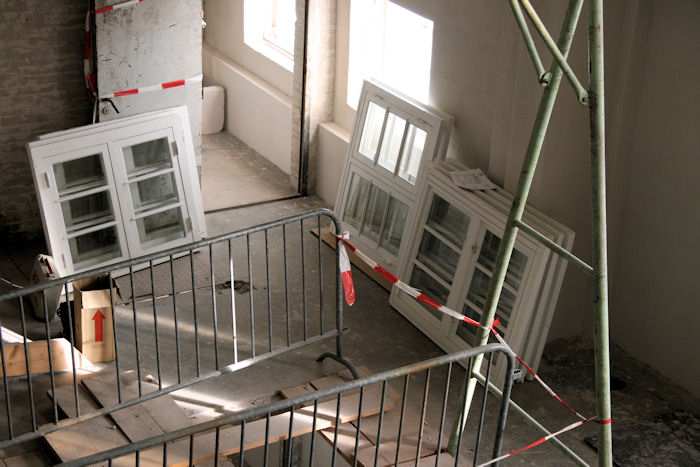 | 07.11.2007 - 10:49 Uhr - Kappeln/Schlei: PK-Speicher im Nordhafen 6. Obergeschoss Blick vom 7. Oberschoss hinab in das 6. Obergeschoss. Hier stehen noch mehr restaurierte Fenster. Diese sollen auf der Ostseite (Schleiseite) des Speichers eingebaut werden. Foto: Eckhard Schmidt - Kappeln - (C) 2007 |