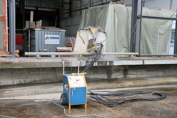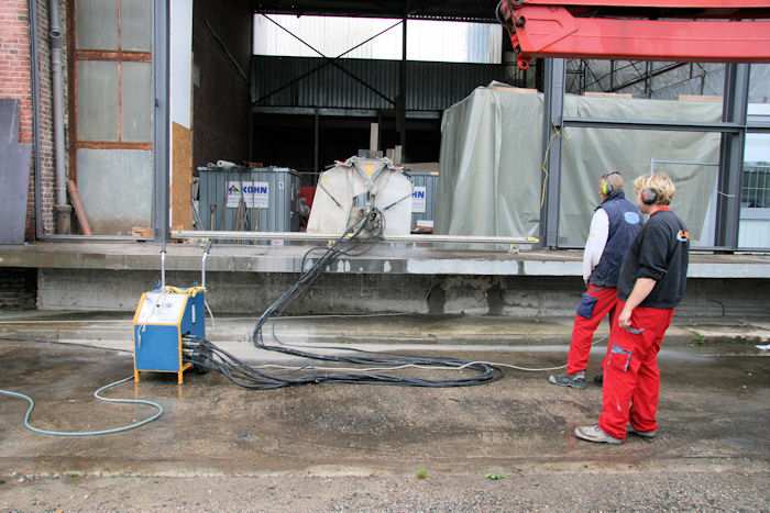 | 21.07.2008 - 14:12 Uhr - Kappeln/Schlei: PK-Speicher im Nordhafen Umbau der Halle nördlich vom Speicher Südlicher Teil der Halle - Sägearbeiten Das Sägeblatt wurde in Richtung Betonwand geschwenkt. Foto: Eckhard Schmidt - Kappeln - (C) 2008 |