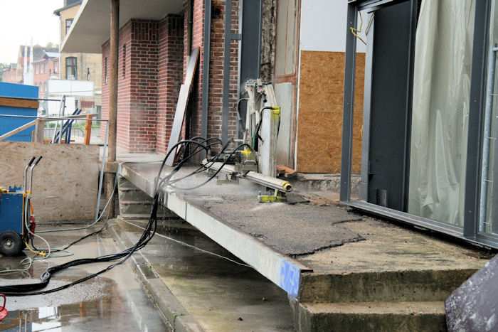 | 21.07.2008 - 9:44 Uhr - Kappeln/Schlei: PK-Speicher im Nordhafen Umbau der Halle nördlich vom Speicher Südlicher Teil der Halle - Sägearbeiten Ein Teil der Rampe vor der Halle muss weichen, da hier ein Tor eingebaut werden soll. Es wird gerade ein Längsschnitt ausgeführt. Foto: Eckhard Schmidt - Kappeln - (C) 2008 |