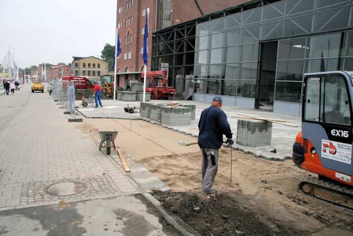 | 21.07.2008 - 9:47 Uhr - Kappeln/Schlei: PK-Speicher im Nordhafen Umbau der Halle nördlich vom Speicher Vorplatz vor dem nördlichen Teil der Halle. Der Platz wird weiter in Richtung Norden gepflastert. Die Pflasterarbeiten werden von Mitarbeitern der Baufirma Bartelsen und Villbrandt - Kappeln ausgeführt. Foto: Eckhard Schmidt - Kappeln - (C) 2008 |