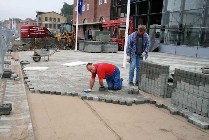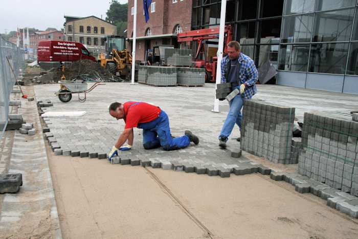 | 21.07.2008 - 9:49 Uhr - Kappeln/Schlei: PK-Speicher im Nordhafen Umbau der Halle nördlich vom Speicher Vorplatz vor dem nördlichen Teil der Halle. Der Platz wird weiter in Richtung Norden gepflastert. Hier werden die Steine im Fischgrätenmuster auf den Sand gelegt. Die Steine werden später noch festgerüttelt. Foto: Eckhard Schmidt - Kappeln - (C) 2008 |