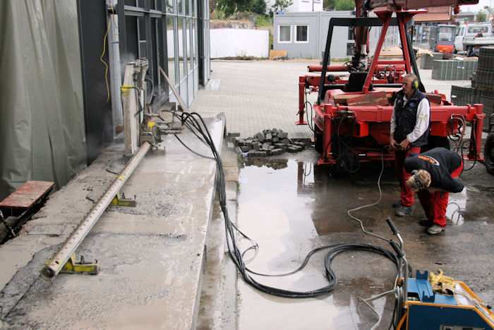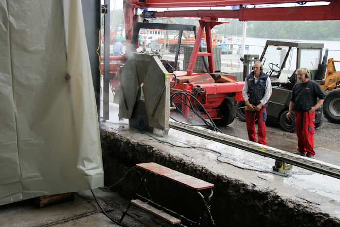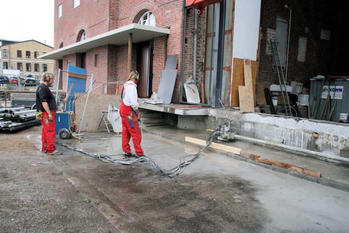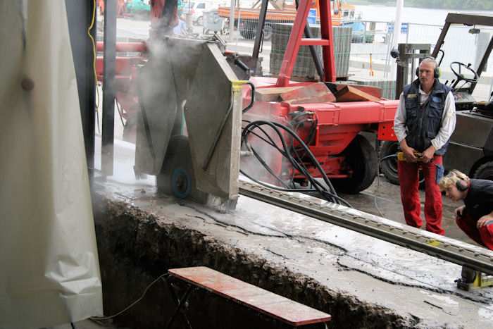 | 21.07.2008 - 9:45 Uhr - Kappeln/Schlei: PK-Speicher im Nordhafen Umbau der Halle nördlich vom Speicher Südlicher Teil der Halle - Sägearbeiten Ein Teil der Rampe vor der Halle muss weichen, da hier ein Tor eingebaut werden soll. Es wird gerade ein Längsschnitt ausgeführt. Foto: Eckhard Schmidt - Kappeln - (C) 2008 |