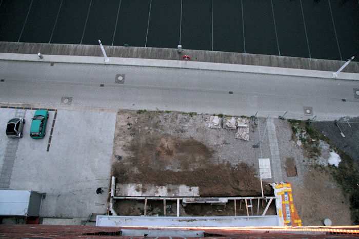 | 17.12.2008 - 8:51 Uhr - Kappeln/Schlei: PK-Speicher im Nordhafen 9. Obergeschoss - Ostseite Blick nach unten auf den Platz vor dem Speicher. Mitarbeiter der Baufirma Bartelsen und Villbrandt aus Kappeln sind dabei die bestehende Rampe etwas in Richtung Gastliegerhafen zu verbreitern. Es werden die vor dem Speicher lagernden Betonplatten verarbeitet. Foto: Eckhard Schmidt - Kappeln - (C) 2008 |