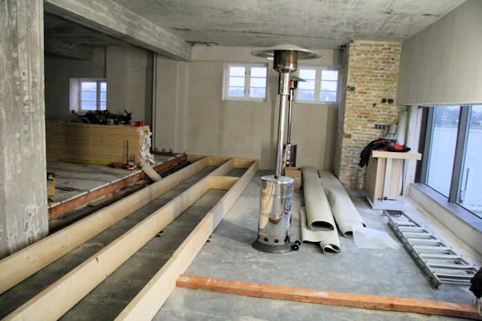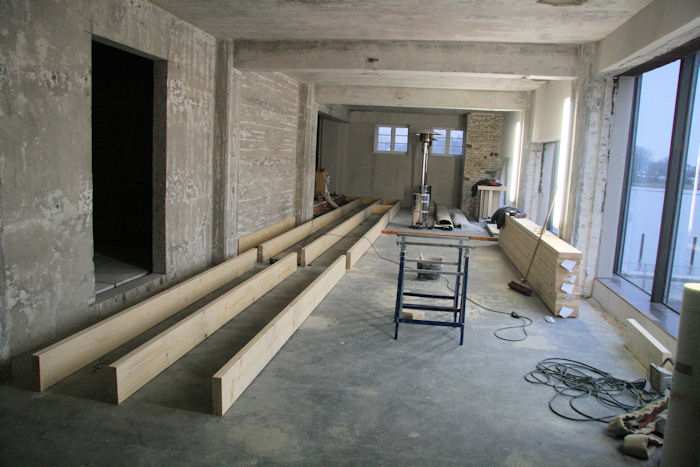 | 17.12.2008 - 8:58 Uhr - Kappeln/Schlei: PK-Speicher im Nordhafen 1. Obergeschoss - Südseite Die ersten verleimten Holzbalken für den Boden wurden in Ost-West-Richtung montiert. Foto: Eckhard Schmidt - Kappeln - (C) 2008 |
