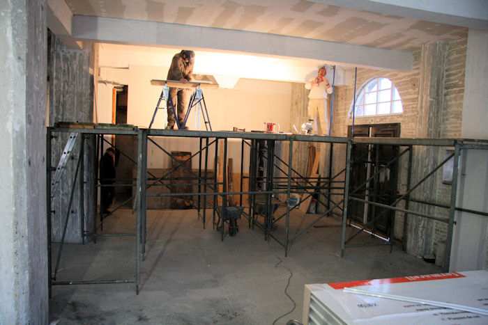 | 17.12.2008 - 9:04 Uhr - Kappeln/Schlei: PK-Speicher im Nordhafen Erdgeschoss - Ostseite Klaus Lausen und Manfred Möller sind dabei die Decke von unten mit FERMACELL Gipsfaser-Platten zu verkleiden. Foto: Eckhard Schmidt - Kappeln - (C) 2008 |