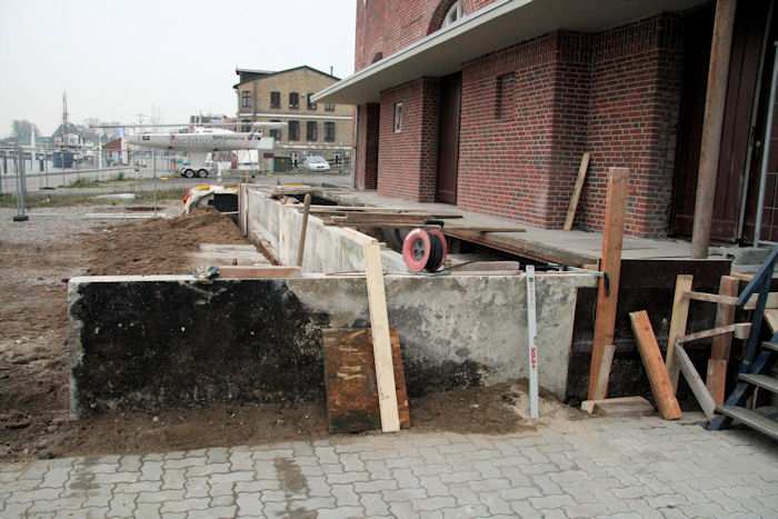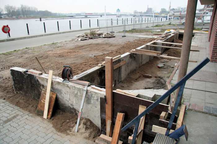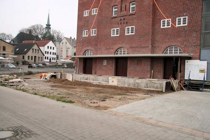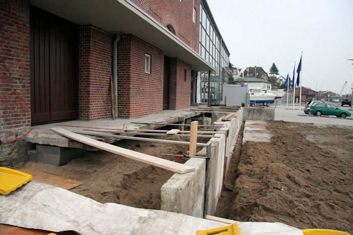 | 17.12.2008 - 9:12 Uhr - Kappeln/Schlei: PK-Speicher im Nordhafen Ostseite des Speichers Die Rampe (rechts) wird etwas weiter in Richtung Gastliegerhafen (links) verbreitert. Es werden die hier lagernden Betonplatten verarbeitet. Foto: Eckhard Schmidt - Kappeln - (C) 2008 |