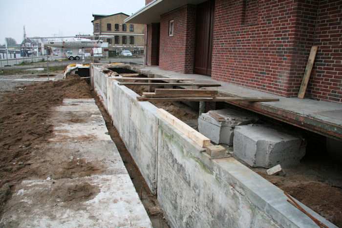 | 17.12.2008 - 9:11 Uhr - Kappeln/Schlei: PK-Speicher im Nordhafen Ostseite des Speichers Die Rampe (links) wird etwas weiter in Richtung Gastliegerhafen (rechts) verbreitert. Es werden die hier lagernden Betonplatten verarbeitet. Foto: Eckhard Schmidt - Kappeln - (C) 2008 |