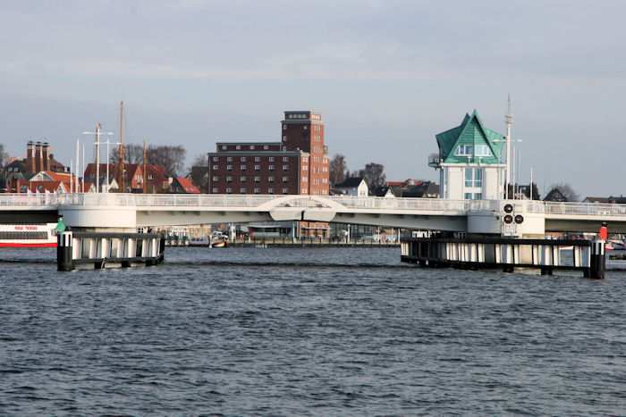 | 02.04.2010 - 9:20 Uhr - Kappeln/Schlei: ASC-Yachthafen Ansichten von der Außenbrücke PK-Speicher im Nordhafen Schleibrücke mit den Klappen und dem Brückenwärterhaus Foto: Eckhard Schmidt - Kappeln - (C) 2010 |