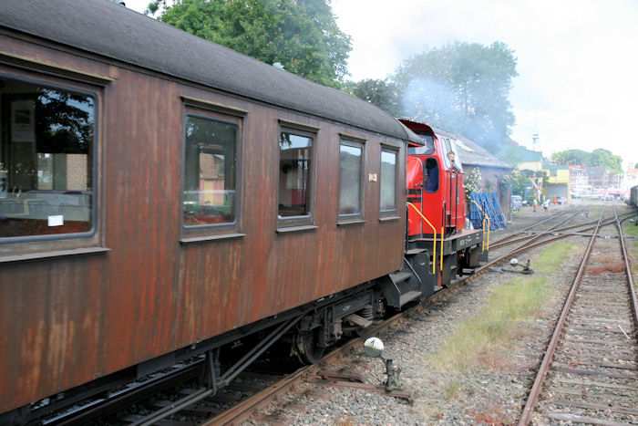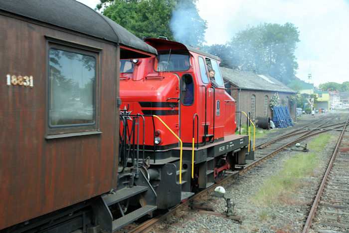 | 27.06.2010 - 11:00:30 Uhr - Kappeln/Schlei: Angelner Dampfeisenbahn Erste Tagesfahrt: Kappeln - Süderbrarup und zurück Am Ende des Zuges die kleine Diesellok Nr. 1 Zuckersusi". Foto: Eckhard Schmidt - Kappeln - (C) 2010 |