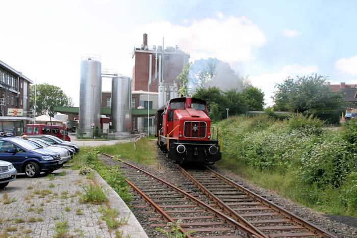 | 27.06.2010 - 11:00:41 Uhr - Kappeln/Schlei: Angelner Dampfeisenbahn Erste Tagesfahrt: Kappeln - Süderbrarup und zurück Der Zug passiert jetzt das Cremilk-Werk in Richtung Süderbrarup. Foto: Eckhard Schmidt - Kappeln - (C) 2010 |