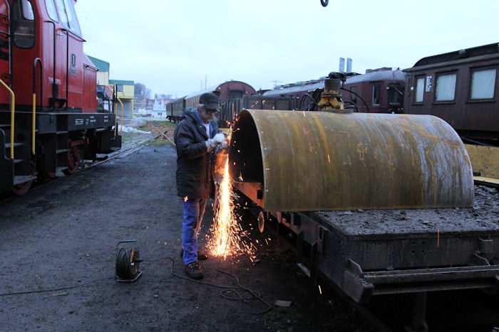 | 22.11.2010 - 8:32 Uhr - Kappeln/Schlei: Angelner Dampfeisenbahn Dampflok S1916 - Kesselreparatur Heute soll das zweite vordere halbrund gewalzte Kesselblech eingebaut werden. Vom Kesselblech muss noch etwas in der Länge abgeschliffen werden. Foto: Eckhard Schmidt - Kappeln - (C) 2010 |