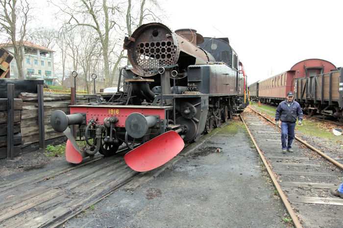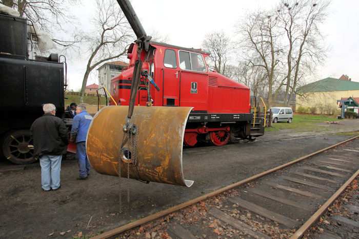 | 22.11.2010 - 10:14 Uhr - Kappeln/Schlei: Angelner Dampfeisenbahn Dampflok S1916 - Kesselreparatur Die Dampflok wird mit Hilfe der Diesellok Zuckersusi" aus dem Lokschuppen herausgezogen. Foto: Eckhard Schmidt - Kappeln - (C) 2010 |
