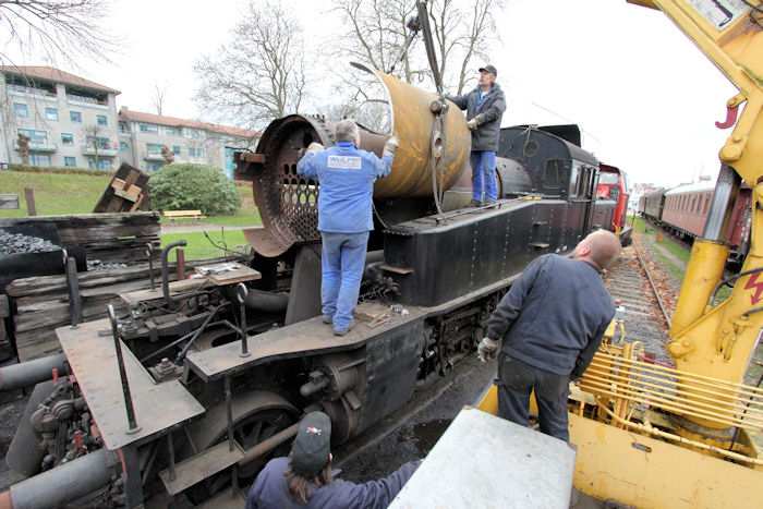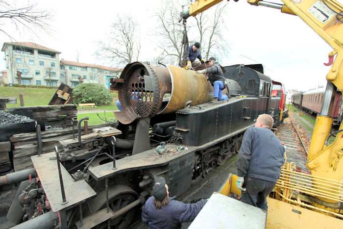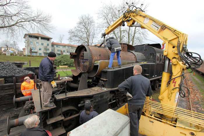 | 22.11.2010 - 10:23 Uhr - Kappeln/Schlei: Angelner Dampfeisenbahn Dampflok S1916 - Kesselreparatur Das zweite Kesselblech wird langsam abgesenkt. Foto: Eckhard Schmidt - Kappeln - (C) 2010 |