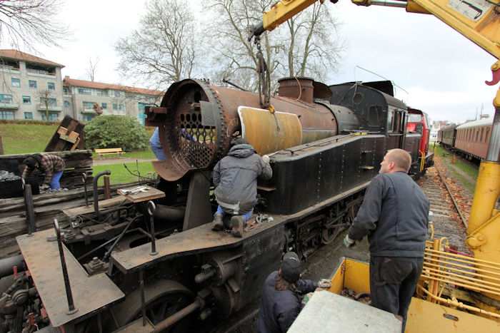 | 22.11.2010 - 10:26 Uhr - Kappeln/Schlei: Angelner Dampfeisenbahn Dampflok S1916 - Kesselreparatur Vorsichtig wird das Kesselblech abgesenkt. Foto: Eckhard Schmidt - Kappeln - (C) 2010 |