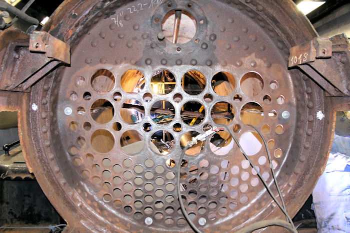 | 23.11.2010 - 8:39 Uhr - Kappeln/Schlei: Angelner Dampfeisenbahn Dampflok S1916 - Kesselreparatur Blick auf die vordere Rauchkammerrohrwand. Foto: Eckhard Schmidt - Kappeln - (C) 2010 |