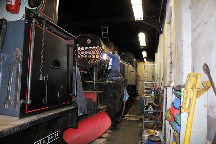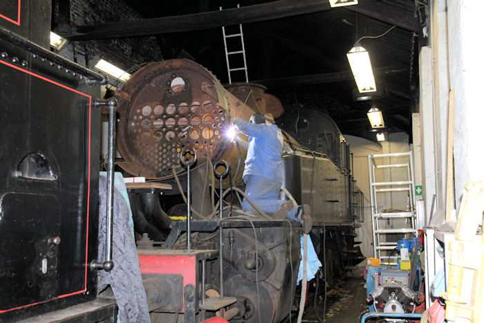 | 23.11.2010 - 8:30 Uhr - Kappeln/Schlei: Angelner Dampfeisenbahn Dampflok S1916 - Kesselreparatur Gestern wurde das vordere untere Kesselblech eingebaut. Heute sind zwei Schweißer der Kesselbaufirma Wulff aus Husum dabei die beiden eingebauten unteren Kesselbleche mit dem Rest des Kessels zu verschweißen. Foto: Eckhard Schmidt - Kappeln - (C) 2010 |