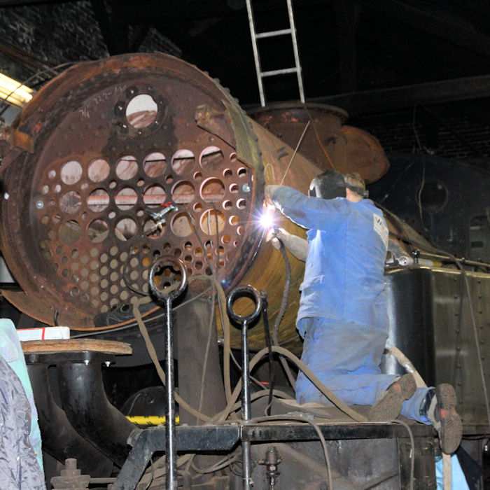 | 23.11.2010 - 8:35 Uhr - Kappeln/Schlei: Angelner Dampfeisenbahn Dampflok S1916 - Kesselreparatur Als Schweißverfahren kommt das Wolfram-Inertgasschweißen (WIG) zum Einsatz. Als Schutzgas wird Argon verwendet. Für weitere Information siehe Wikipedia: Schweißen de.wikipedia.org/wiki/Schweißen Foto: Eckhard Schmidt - Kappeln - (C) 2010 |