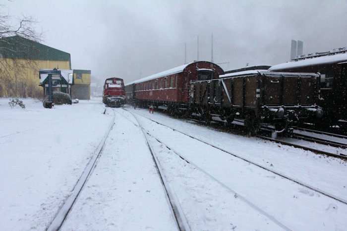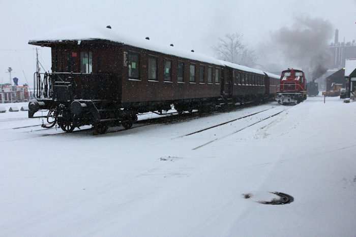 | 05.12.2010 - 9:09 Uhr - Kappeln/Schlei: Angelner Dampfeisenbahn Nikolausfahrt mit Schnee Auf Gleis 2 stehen die Wagen für die heutigen Nikolausfahrten. Foto: Eckhard Schmidt - Kappeln - (C) 2010 |