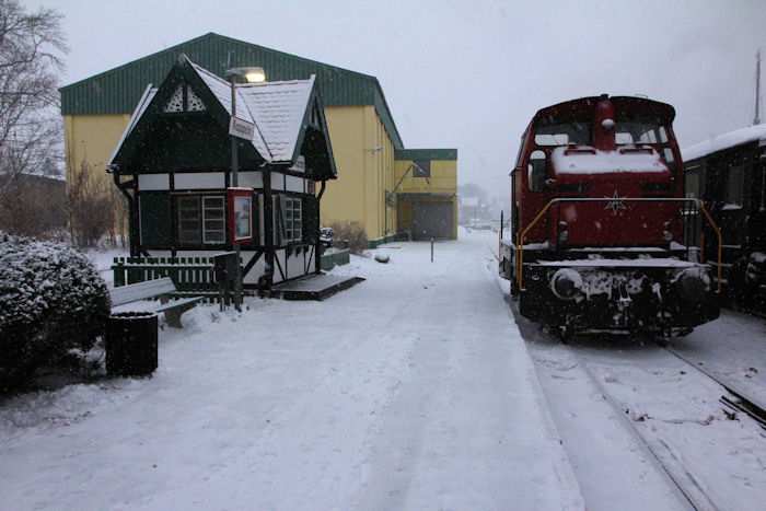 | 05.12.2010 - 9:08 Uhr - Kappeln/Schlei: Angelner Dampfeisenbahn Nikolausfahrt mit Schnee Der neue Fahrkartenschalter und die kleine Diesellok Zuckersusi". Dieter Ludewig soll mit Zuckersusi" gleich vor der ersten Tagesfahrt die Strecke nach Süderbrarup noch einmal abfahren. In den beiden letzten Tagen wurde die Strecke nach Süderbrarup von den Museumsbahnern von Hand freigeschaufelt. Foto: Eckhard Schmidt - Kappeln - (C) 2010 |