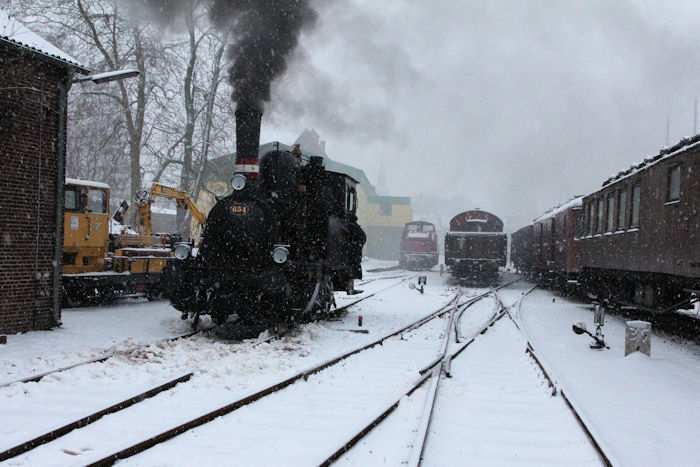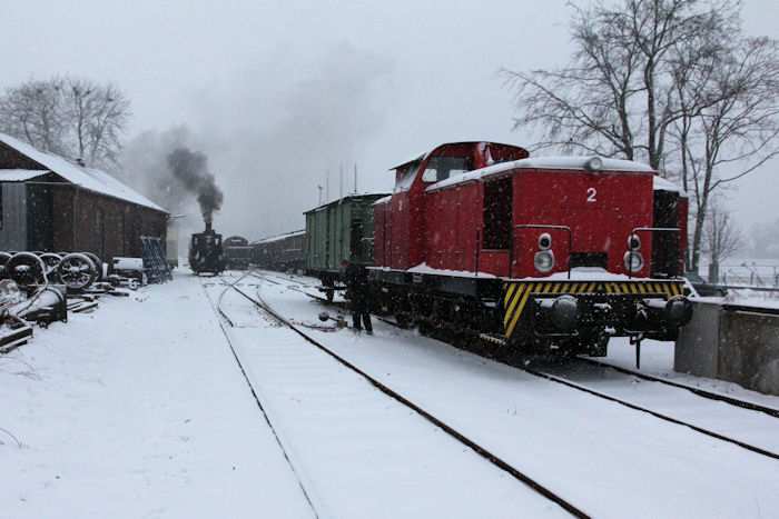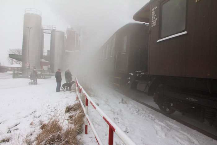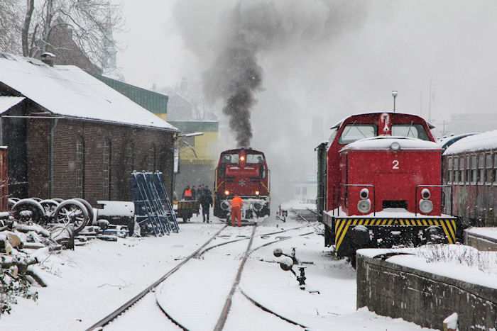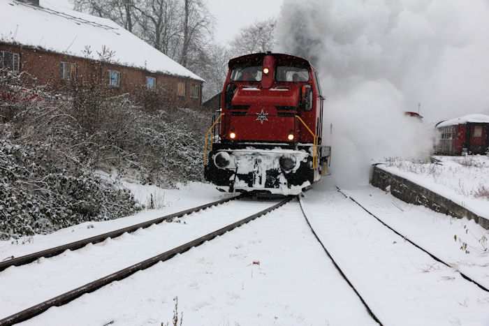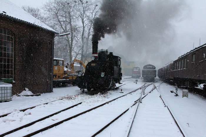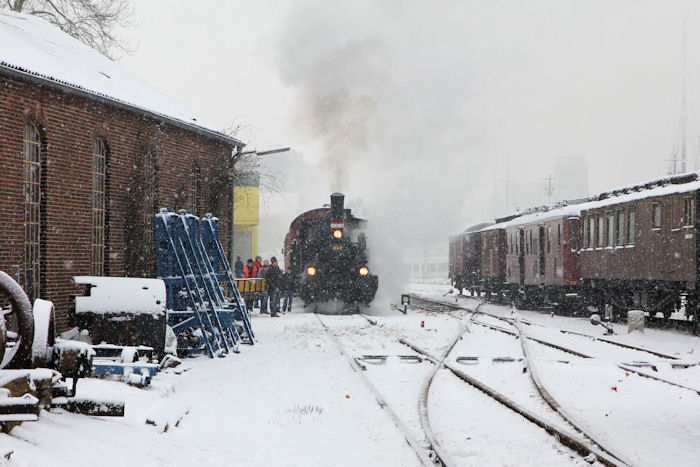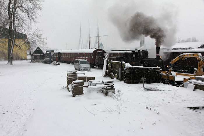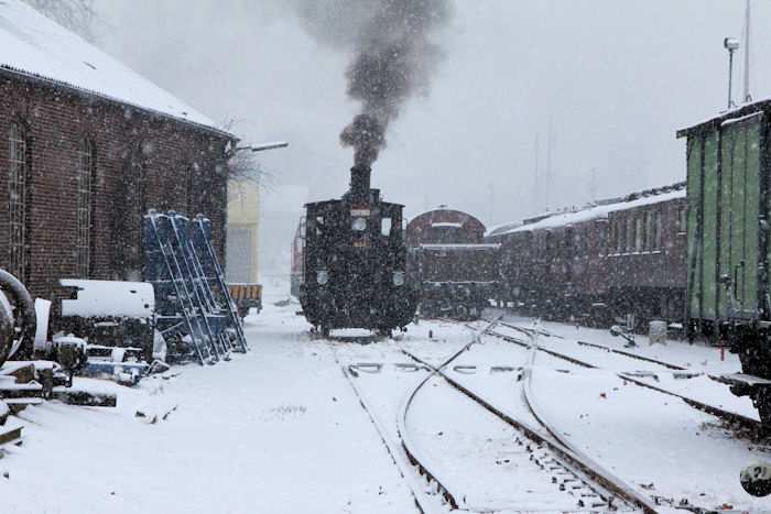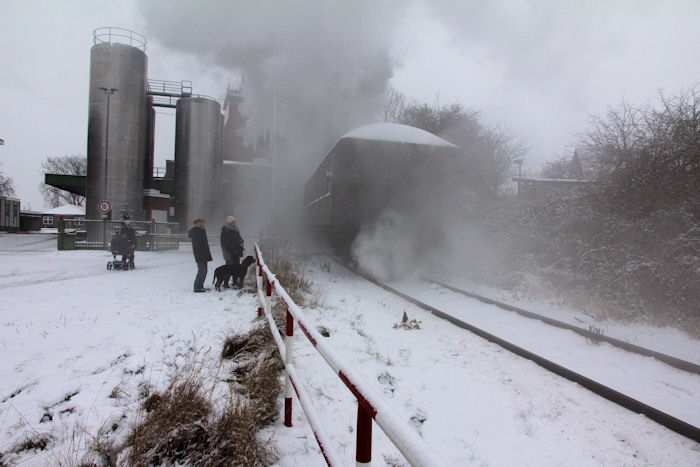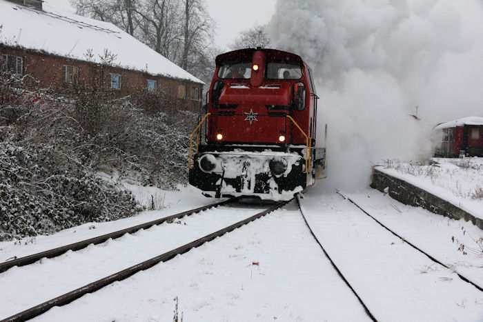 | 05.12.2010 - 9:10 Uhr - Kappeln/Schlei: Angelner Dampfeisenbahn Nikolausfahrt mit Schnee Die kleine Dampflok Julchen" wird gerade angeheizt. Foto: Eckhard Schmidt - Kappeln - (C) 2010 |