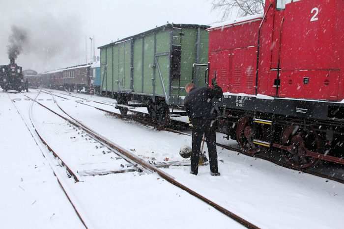 | 05.12.2010 - 9:10 Uhr - Kappeln/Schlei: Angelner Dampfeisenbahn Nikolausfahrt mit Schnee Klaus Jordt reinigt eine Weiche vom Schnee. Foto: Eckhard Schmidt - Kappeln - (C) 2010 |