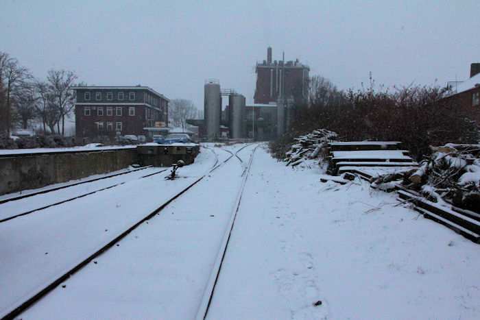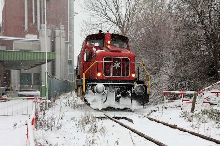 | 05.12.2010 - 11:03:11 Uhr - Kappeln/Schlei: Angelner Dampfeisenbahn Nikolausfahrt mit Schnee Zuckersusi" passiert gerade das Cremilk-Werk. Foto: Eckhard Schmidt - Kappeln - (C) 2010 |