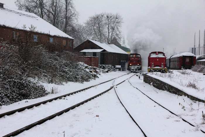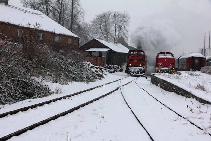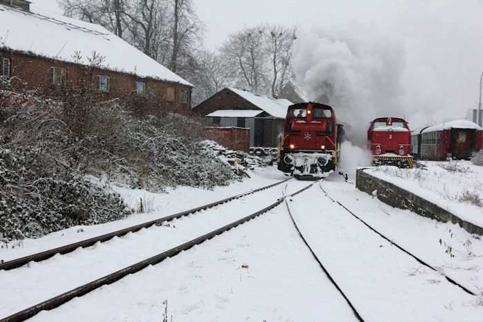 | 05.12.2010 - 11:10:33 Uhr - Kappeln/Schlei: Angelner Dampfeisenbahn Nikolausfahrt mit Schnee Gleich haben beide Loks meinen Standort erreicht. Foto: Eckhard Schmidt - Kappeln - (C) 2010 |