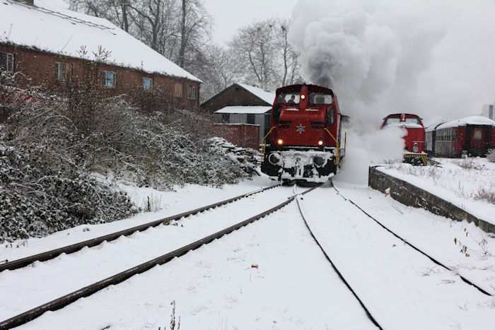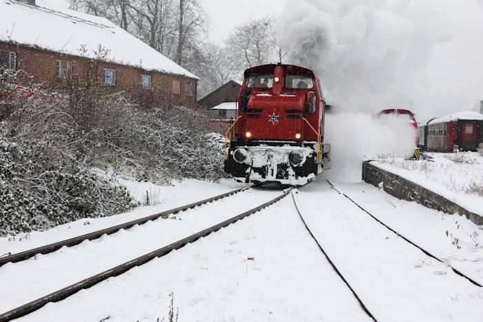 | 05.12.2010 - 10:58 Uhr - Kappeln/Schlei: Angelner Dampfeisenbahn Nikolausfahrt mit Schnee Der Zug steht abfahrbereit auf Gleis 1. Foto: Eckhard Schmidt - Kappeln - (C) 2010 |