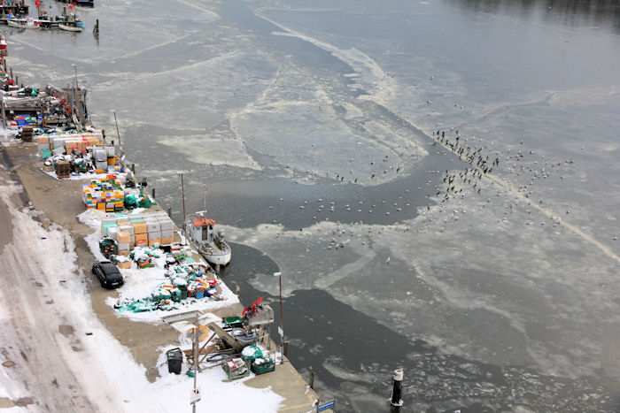 | 22.02.2011 - 8:38 Uhr - Kappeln/Schlei: PK-Speicher im Nordhafen 9. Obergeschoss - Ostseite - Aussicht Fischereihafen Die Fischkutter haben ihre Spuren im Eis hinterlassen. Foto: Eckhard Schmidt - Kappeln - (C) 2011 |
