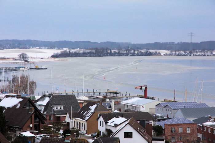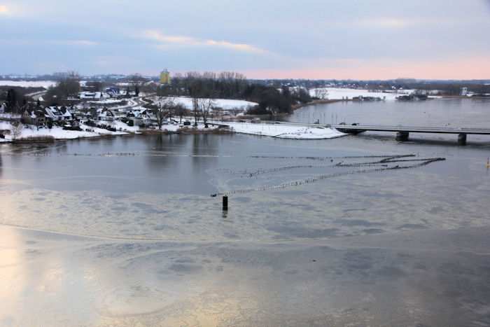 | 22.02.2011 - 8:37 Uhr - Kappeln/Schlei: PK-Speicher im Nordhafen 9. Obergeschoss - Ostseite - Aussicht Heringszaun vom Eis eingeschlossen Foto: Eckhard Schmidt - Kappeln - (C) 2011 |