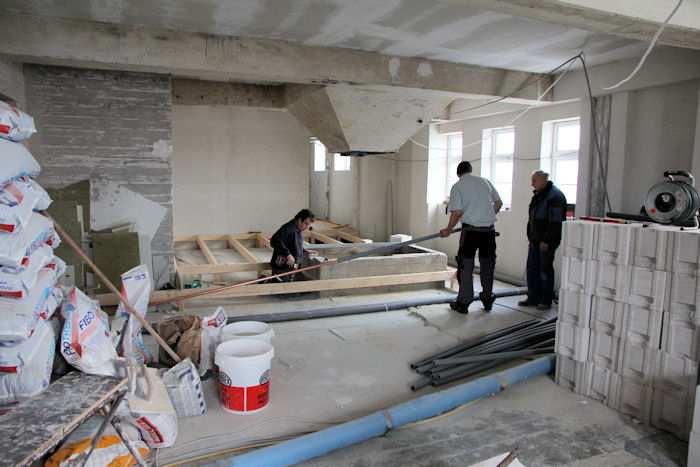 | 22.02.2011 - 8:43 Uhr - Kappeln/Schlei: PK-Speicher im Nordhafen 4. Obergeschoss - Ostseite Es wird der Fußboden angehoben. Süden Osten <---+---> Westen Foto: Eckhard Schmidt - Kappeln - (C) 2011 |