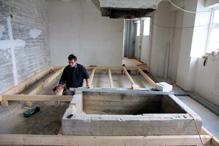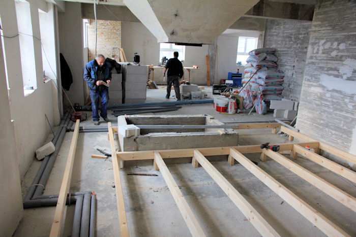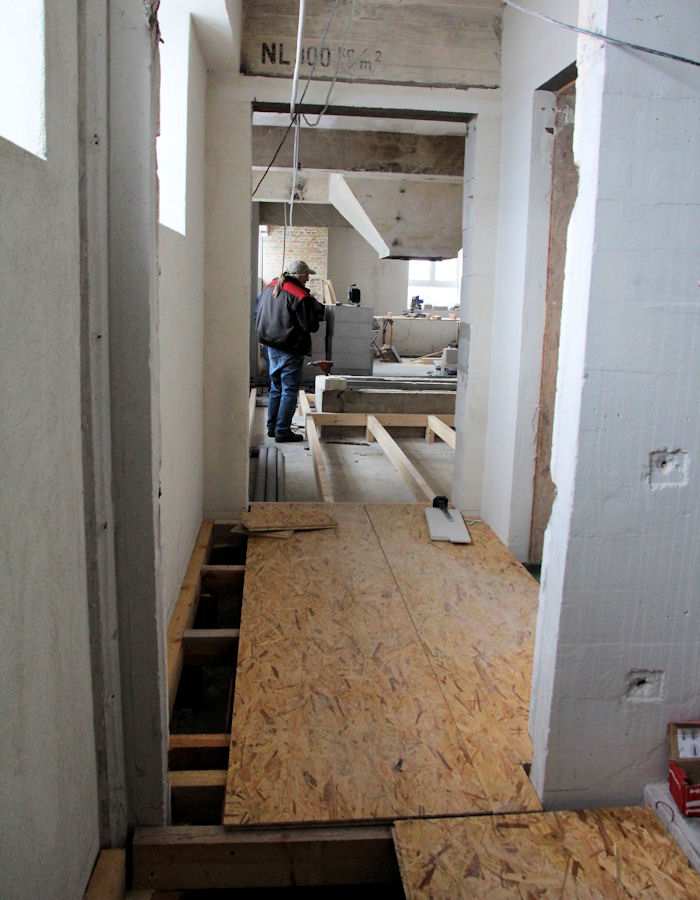 | 22.02.2011 - 8:45 Uhr - Kappeln/Schlei: PK-Speicher im Nordhafen 4. Obergeschoss - Ostseite Auch vor dem Fahrstuhl wird der Fußboden angehoben. Süden Osten <---+---> Westen Foto: Eckhard Schmidt - Kappeln - (C) 2011 |