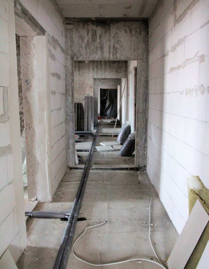 | 22.02.2011 - 8:42 Uhr - Kappeln/Schlei: PK-Speicher im Nordhafen 4. Obergeschoss - Südseite - Zelle 5 bis 2 - Flur Im Flur werden gerade Rohrleitungen verlegt. Westen Süden <---+---> Norden Foto: Eckhard Schmidt - Kappeln - (C) 2011 |