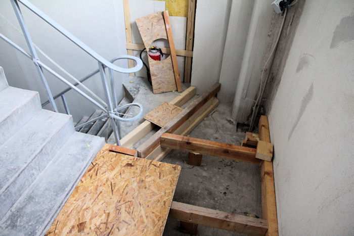 | 22.02.2011 - 8:44 Uhr - Kappeln/Schlei: PK-Speicher im Nordhafen 4. Obergeschoss - Nordostecke - Treppenhaus Im Treppenhaus wird ebenfalls der Boden angehoben. Foto: Eckhard Schmidt - Kappeln - (C) 2011 |