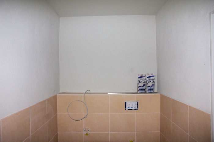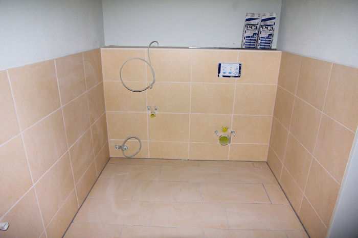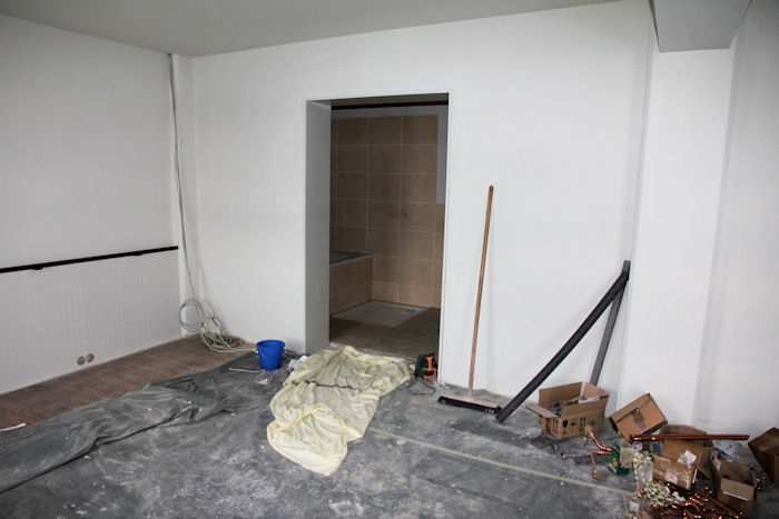| 22.02.2011 - 8:50 Uhr - Kappeln/Schlei: PK-Speicher im Nordhafen 2. Obergeschoss - Südseite - Zimmer Mitte - Zelle 3 Die Wände und der Fußboden der südlichen Hälfte der Zelle 3 wurde gefliest. Foto: Eckhard Schmidt - Kappeln - (C) 2011 |