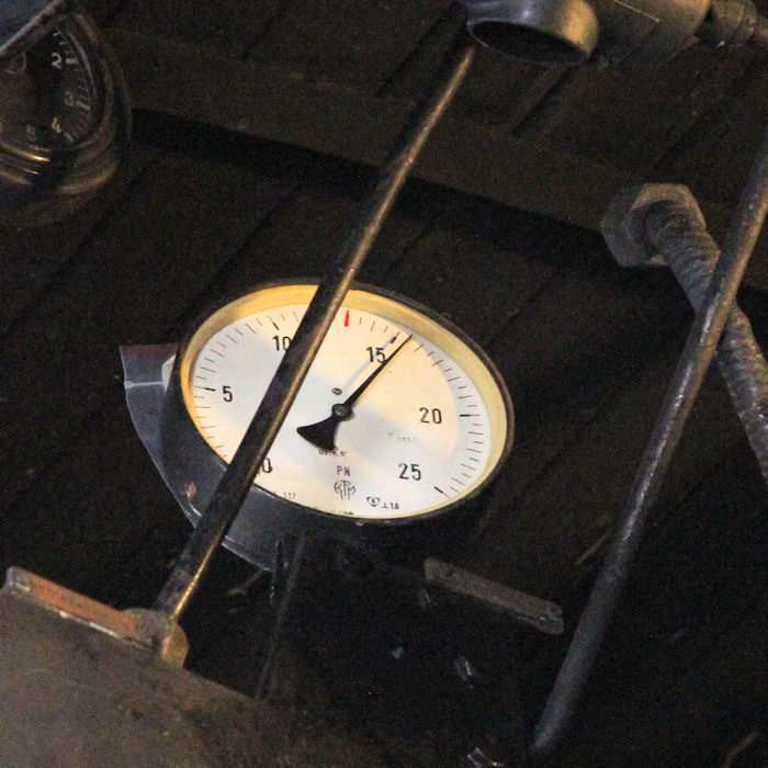 | 25.03.2011 - 13:14 Uhr - Kappeln/Schlei: Angelner Dampfeisenbahn Dampflok S1916 - Kessel - TÜV - Wasserdruckprobe Die Wasserdruckprobe hat begonnen. Das Manometer zeigt 15,5 bar und muss noch auf 17 bar erhöht werden. Foto: Eckhard Schmidt - Kappeln - (C) 2011 |