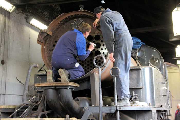 | 25.03.2011 - 13:19 Uhr - Kappeln/Schlei: Angelner Dampfeisenbahn Dampflok S1916 - Kessel - TÜV - Wasserdruckprobe Gerd-Dieter Höffmann kontrolliert jetzt die Rohrwand der Rauchkammer auf Wasserleckagen. Foto: Eckhard Schmidt - Kappeln - (C) 2011 |