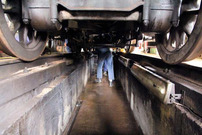 | 25.03.2011 - 13:23 Uhr - Kappeln/Schlei: Angelner Dampfeisenbahn Dampflok S1916 - Kessel - TÜV - Wasserdruckprobe Gerd-Dieter Höffmann kontrolliert jetzt von der Grube aus die Unterseite des Kessels und die zugehörigen Armaturen auf Wasserleckagen. Ergebnis der Wasserdruckprobe: Alles OK. Foto: Eckhard Schmidt - Kappeln - (C) 2011 |